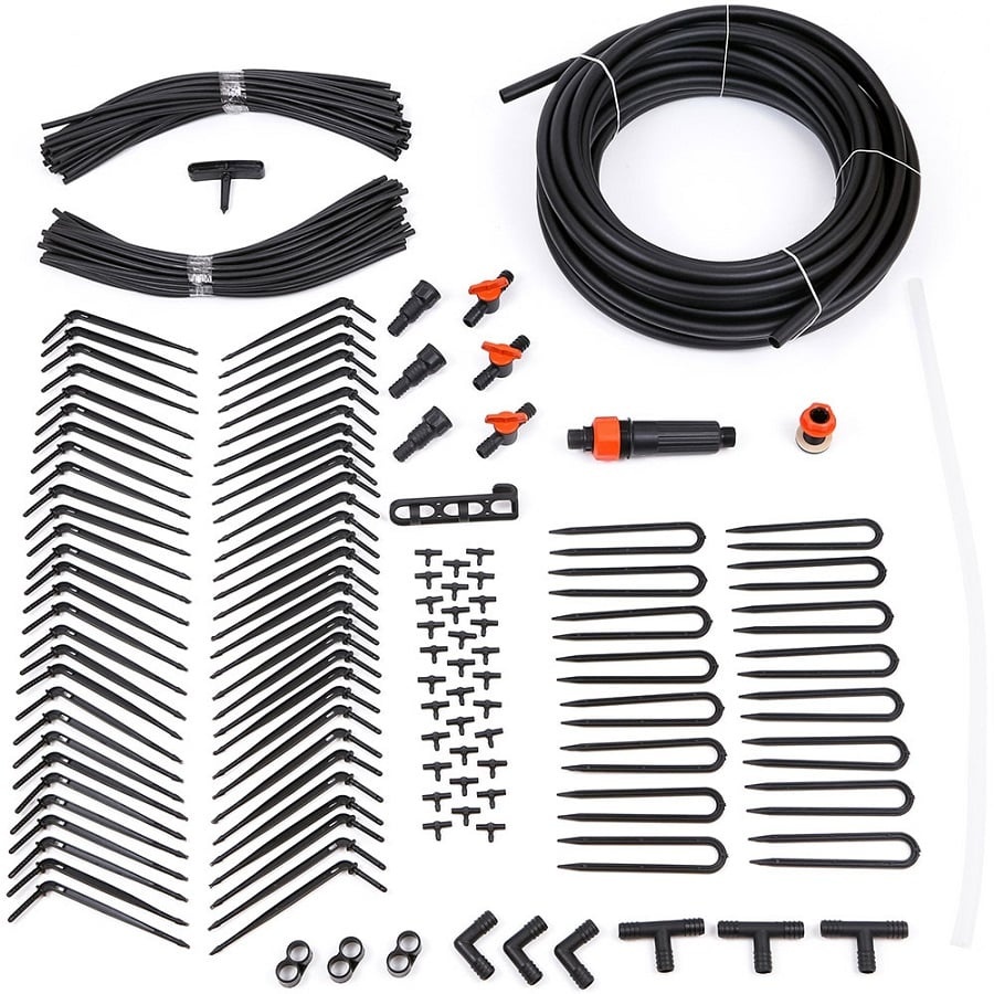 Уголки и большие тройники не дают магистральному шлангу заламываться тогда, когда его поворачивают на 90 градусов. Краны и заглушки позволяют организовать сразу несколько линий полива – от одной емкости будет поливаться несколько грядок (подача регулируется). Шланги сделаны из черного полиэтилена, и это не дает воде, которая находится внутри, зацветать. В наличии есть прозрачная трубка, за счет чего можно следить за уровнем наполнения емкости, никогда не даст забыть своевременно наполнить ёмкость водой. Наполнение ёмкости можно автоматизировать с помощью насосного оборудования и автоматики систем водоснабжения. Полив подходит для 60 растений, растущих на участках площадью в 18 кв. м.