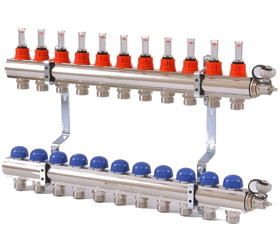 Коллекторная группа Uni-Fitt 11 выходов с расходомерами и термостатическими. вентилями – прибор для подачи, распределения и регулирования рабочей среды от основного трубопровода в системах радиаторного и напольного отопления.